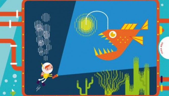 Aprende tudo sobre a vida marinha com visão de robot! Usa a grelha especial por cima de cada página e desloca-a para criares uma incrível ilusão ótica de movimento.