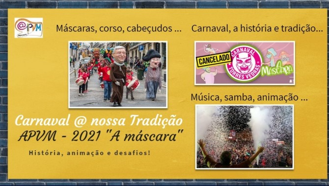 O Agrupamento de Escolas Padre Vítor Melícias preparou uma apresentação sobre o tema do Carnaval @ nossa tradição com a história, músicas e desafios para a sua comunidade escolar. Pode comemorar este ano o Carnaval 2021 “A máscara”.